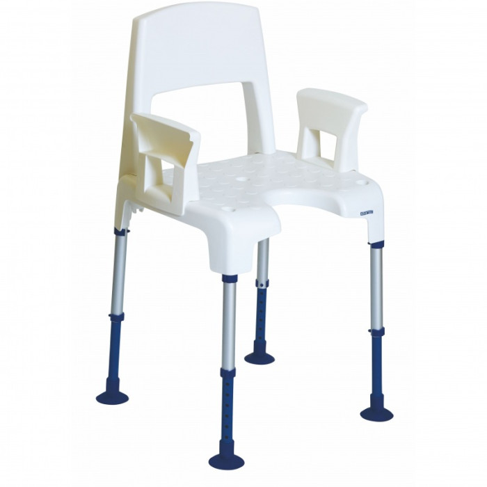 Стул для душа со спинкой. Сиденье изготовлено из материала, устойчивого к дезинфицирующим средствам (пластик), нескользящее. Регулируемая высота. Спинка и подлокотники снимаются. Максимальная нагрузка – 160 кг.